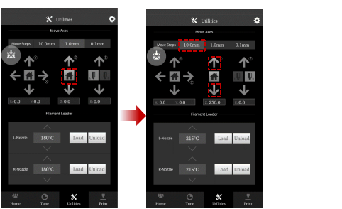 Senken Sie die Z-Achsen-Plattform, indem Sie die Pfeile auf dem Touchscreen des Geräts verwenden. Sehen Sie sich die folgenden Bilder an, um eine Referenz für die Position dieser Optionen zu erhalten.